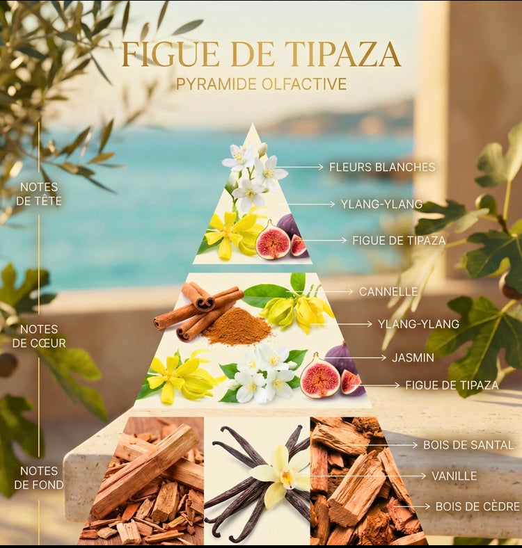 Notes de tête : Fleurs blanches, Ylang-Ylang, Figue de Tipaza